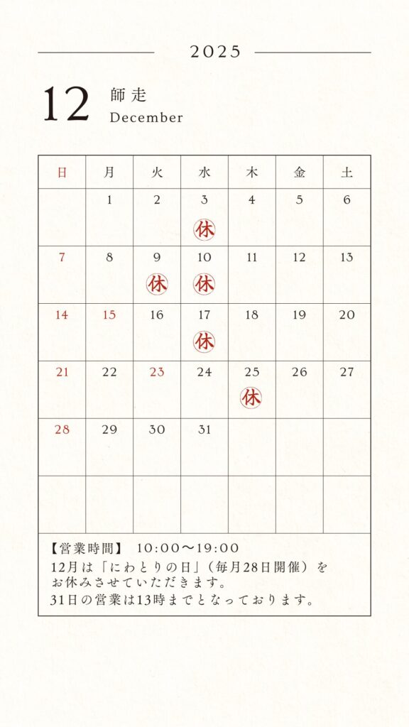 12月は「にわとりの日」(毎月28日開催)をお休みさせていただきます。クリスマスから年末年始にかけて、全力で対応させていただくためです。何卒ご理解賜りますようお願い申し上げます。来年1月より通常通り実施いたします。